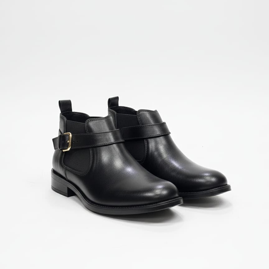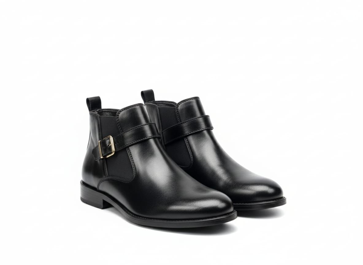 Elevate your look with these sleek black ankle boots, featuring a smooth finish and a modern buckle strap for a refined edge. Designed for comfort and durability, they’re perfect for office wear, smart casual outfits, and evening occasions.